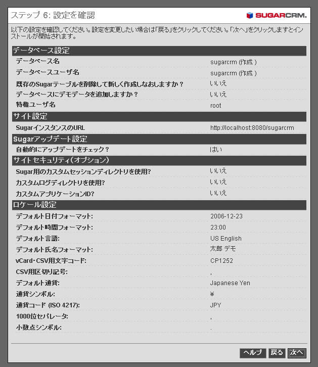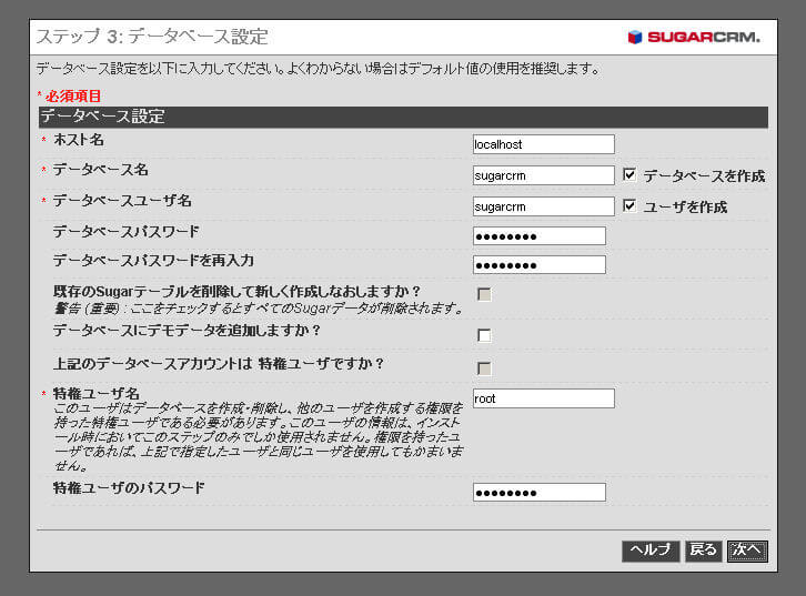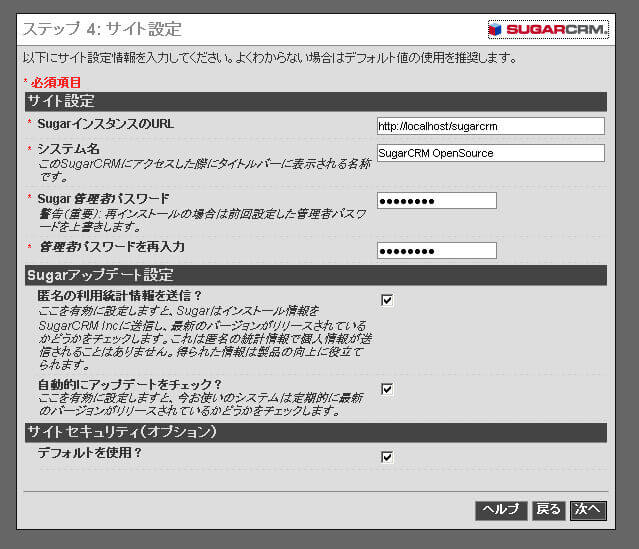 SugarCRMのインストール時に自動的にSugarCRMの特権ユーザ(ユーザ名:admin)が作成されます。 そのユーザのパスワードを設定します。設定したパスワードは忘れないようにしましょう。 |