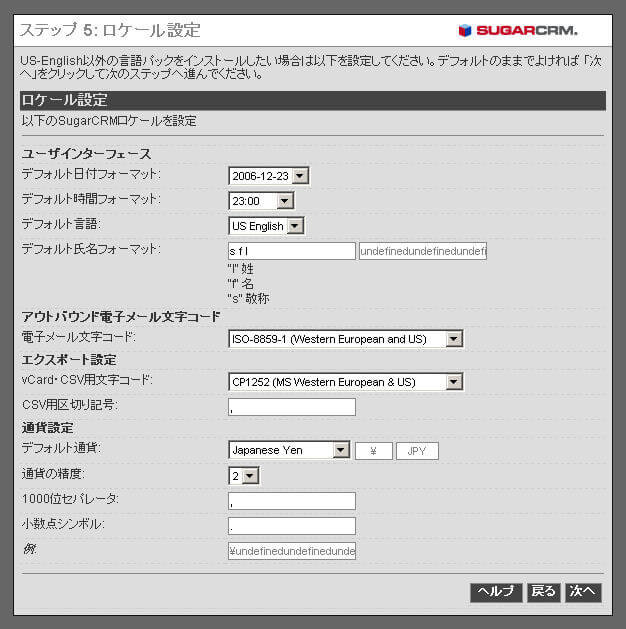 ステップ5:ロケール設定」画面が表示されるので、「デフォルト通貨」ボックスの一覧から「Japanese Yen」を選択します。